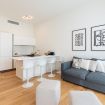 L'appartamento di 50 mq si apre su un ampio soggiorno con divano letto, tavolo da pranzo e cucina a vista completamente attrezzata.