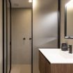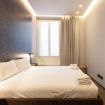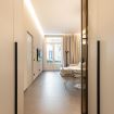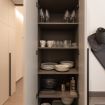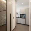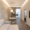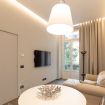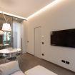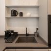L’appartamento si apre su una zona giorno con comodo divano e una cucina compatta completamente attrezzata, perfettamente integrata nell’ambiente. I materiali raffinati e le finiture di pregio creano un’atmosfera accogliente e contemporanea.