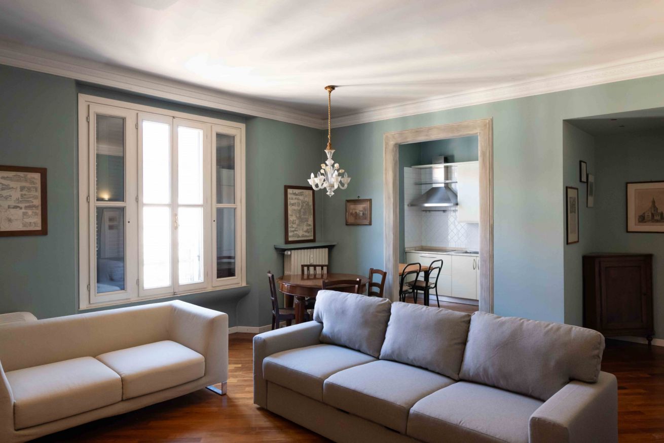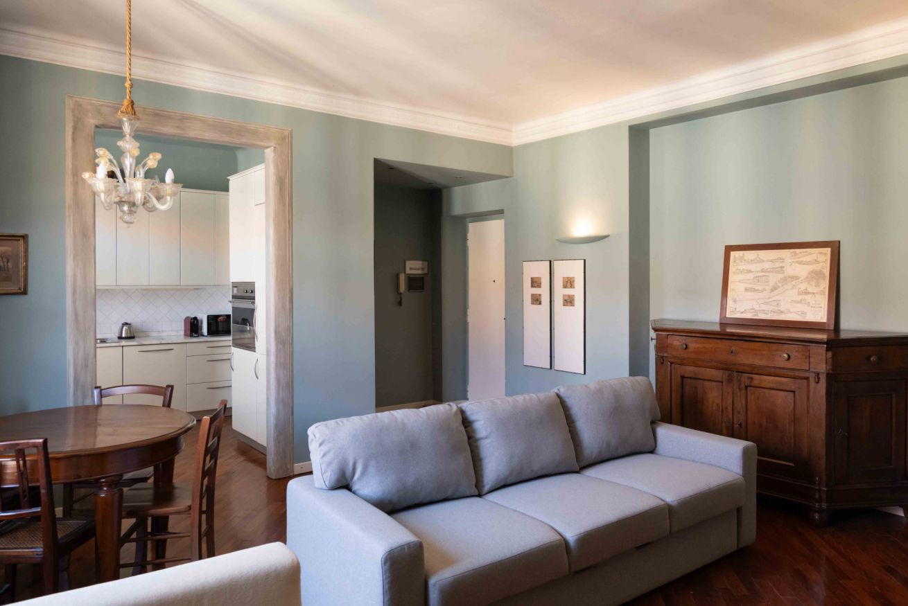 Soggiorno luminoso con divano letto matrimoniale, perfetto per ospitare altre due persone. Ambiente accogliente, ideale per rilassarsi dopo una giornata in città.