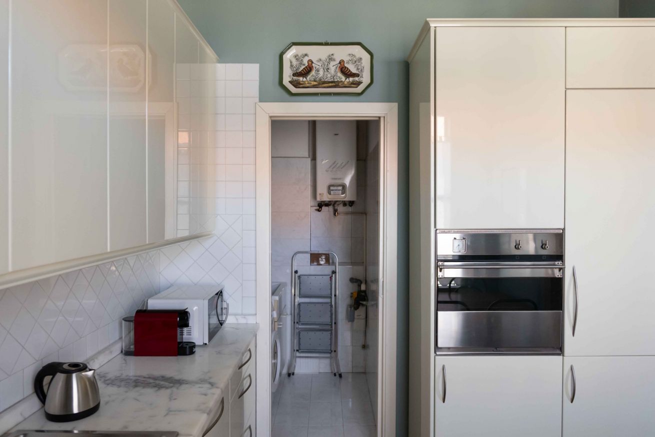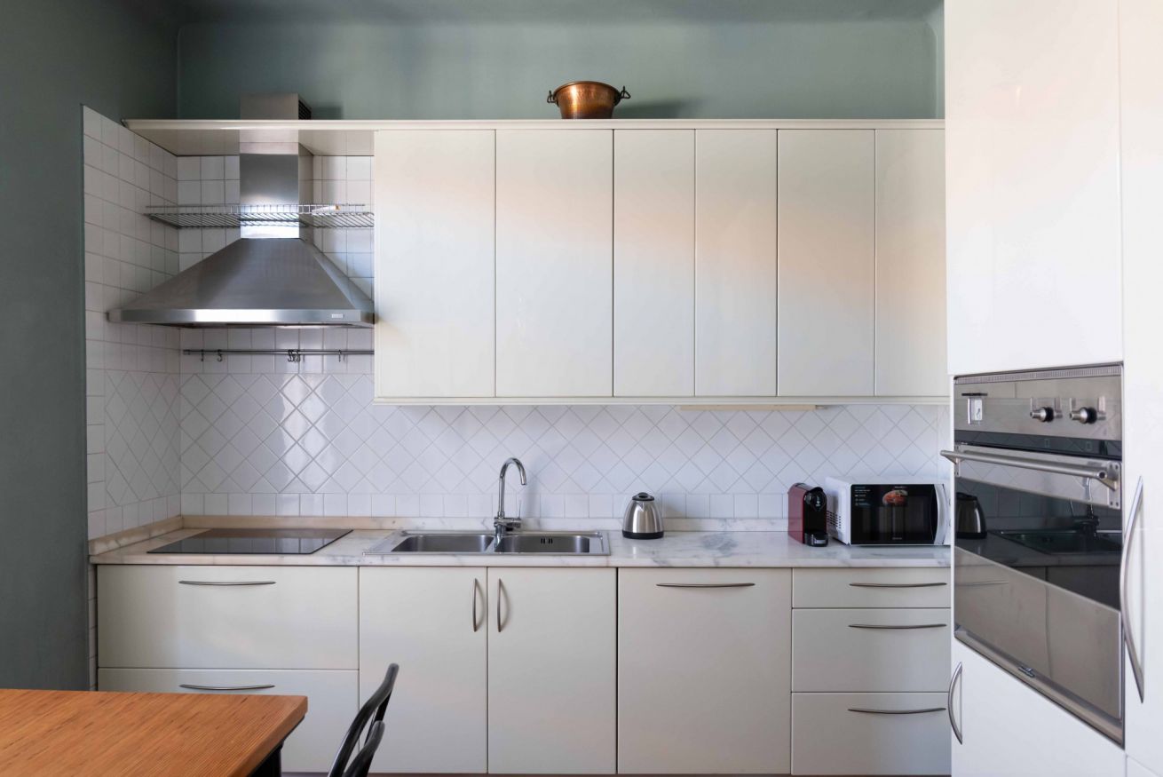 Cucina completamente attrezzata con piano cottura, frigorifero, forno/microonde, utensili, stoviglie e macchina del caffè — perfetta sia per soggiorni brevi che più lunghi.
